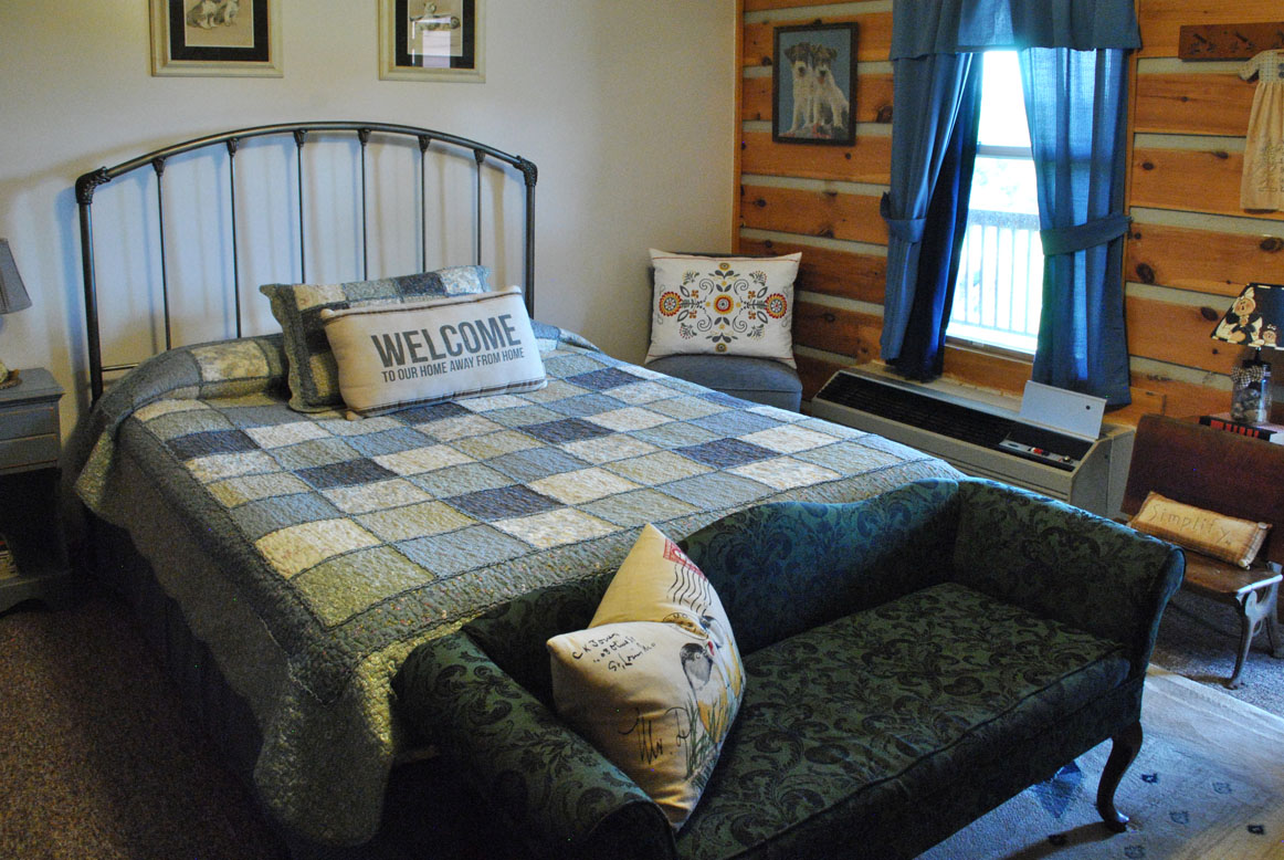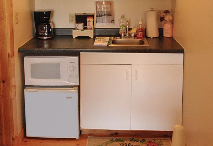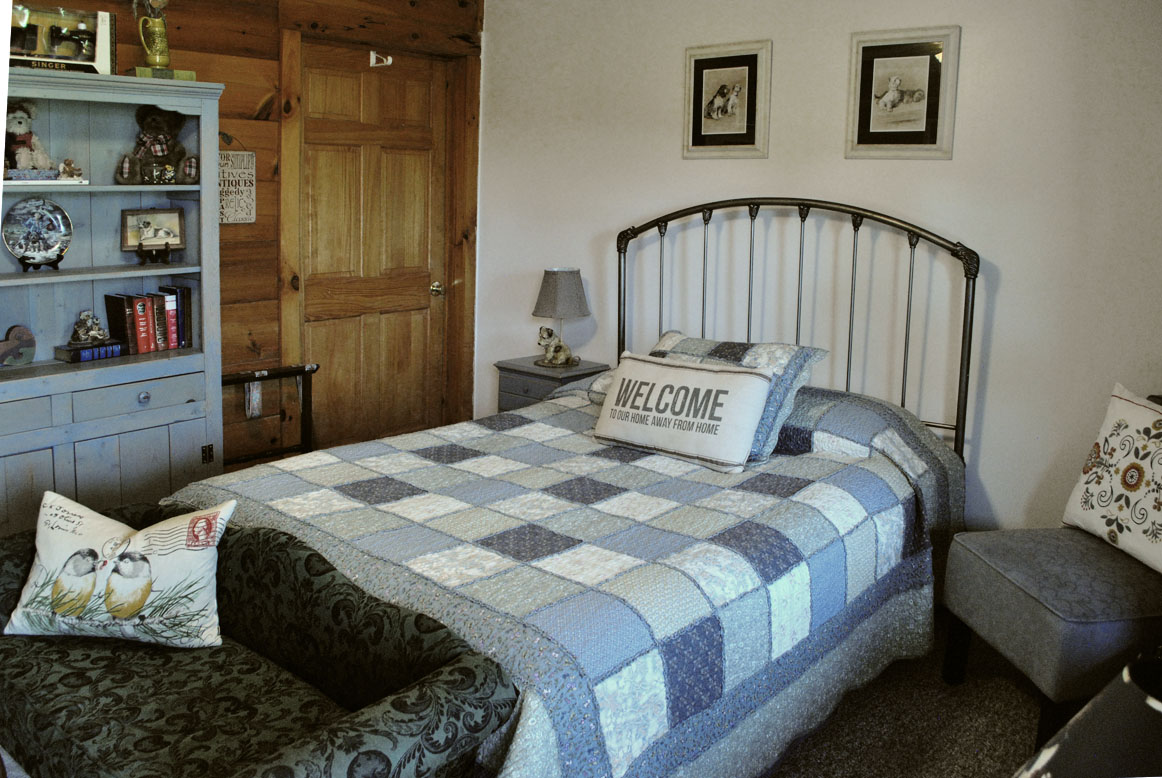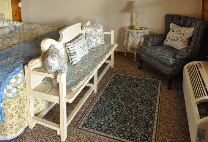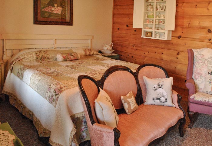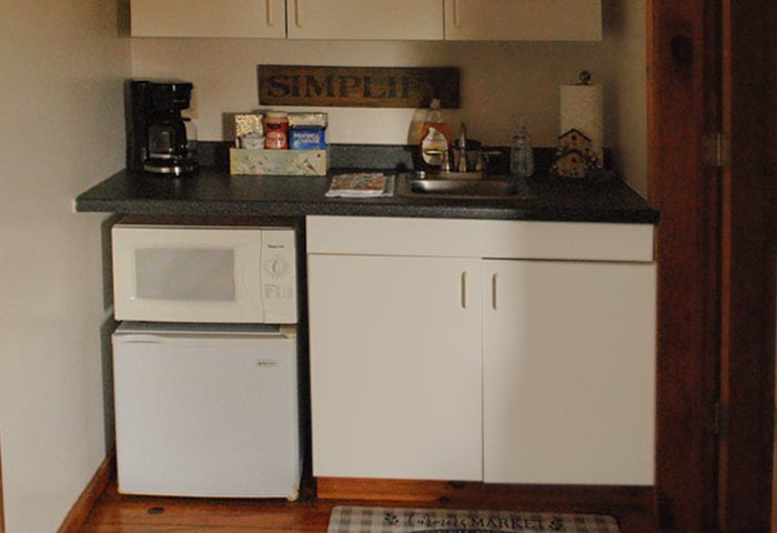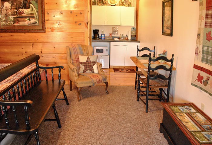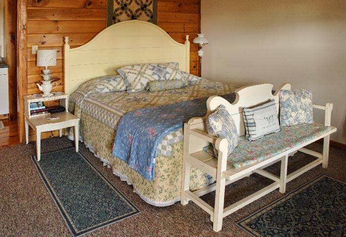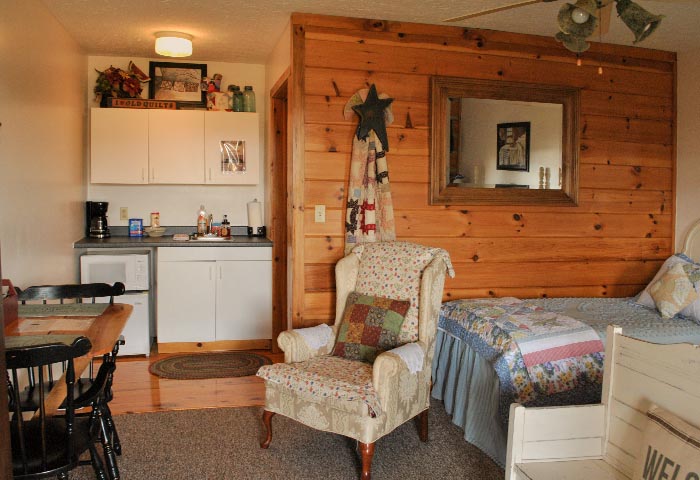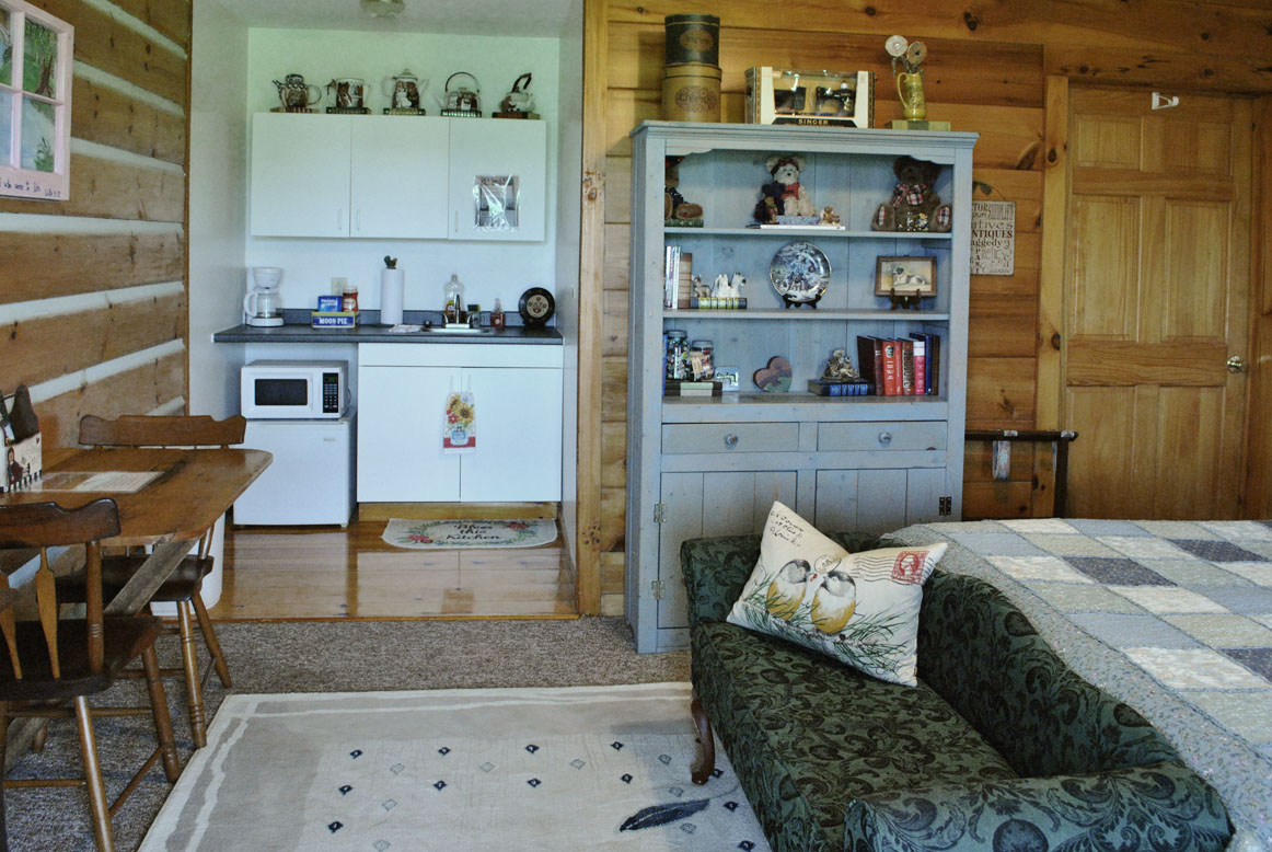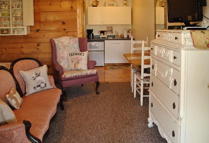 This room filled w/ cozy country charm has a queen-sized bed, a kitchenette and full bathroom.
