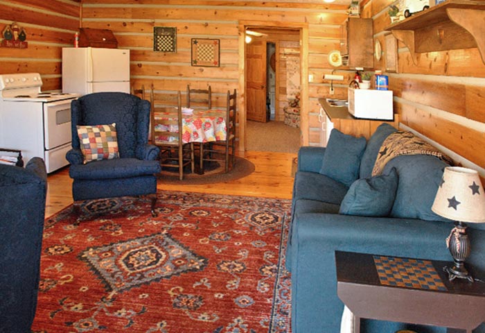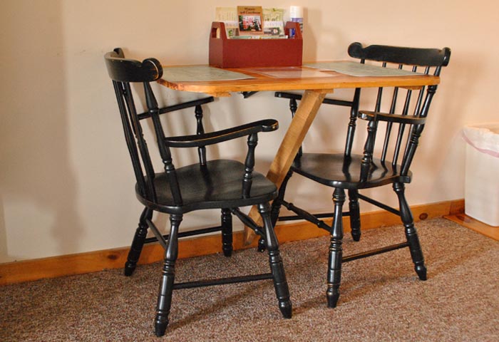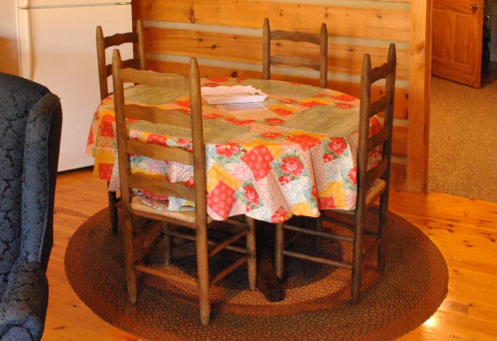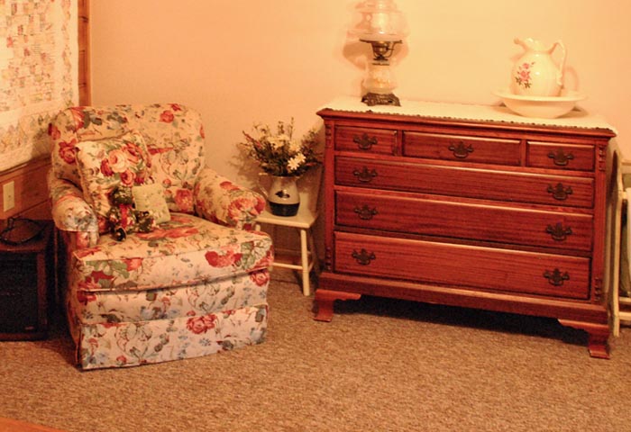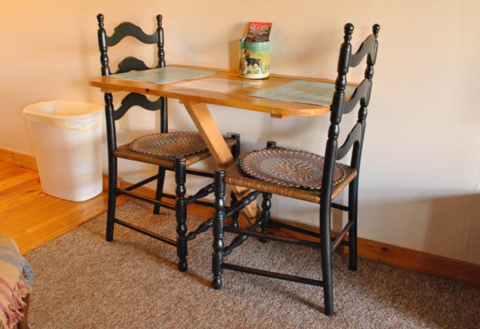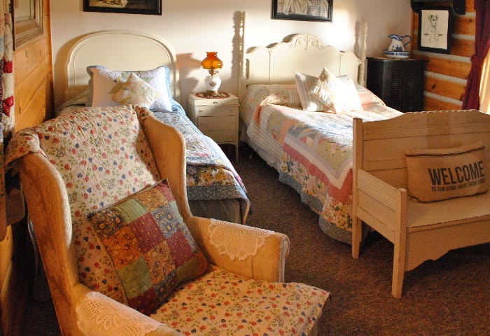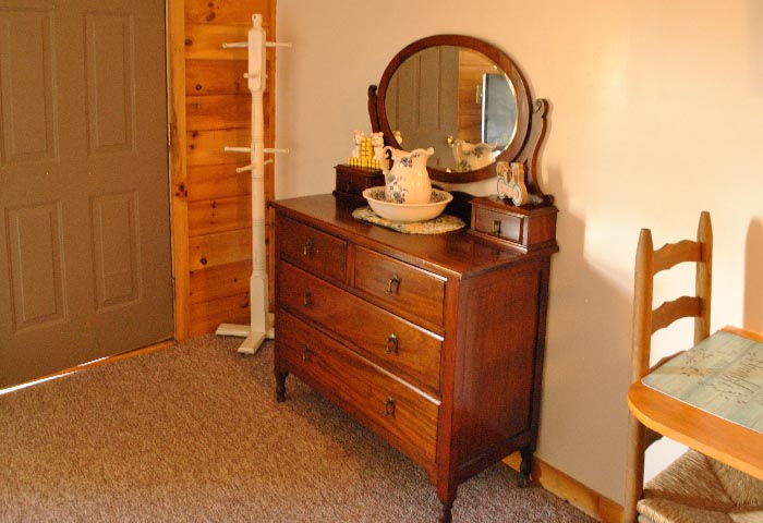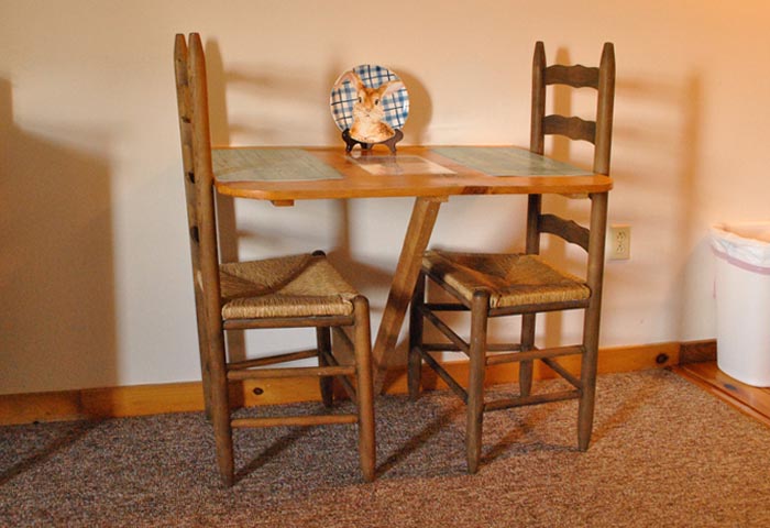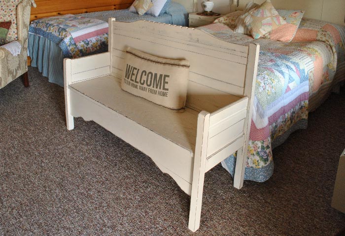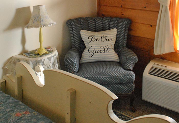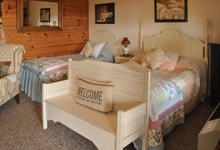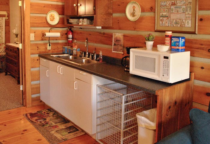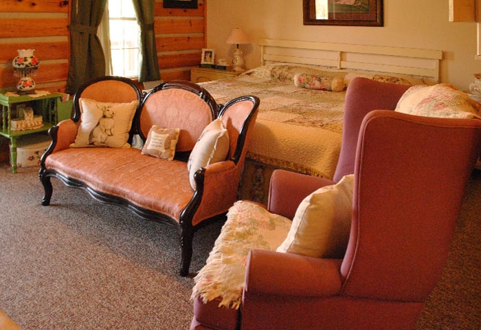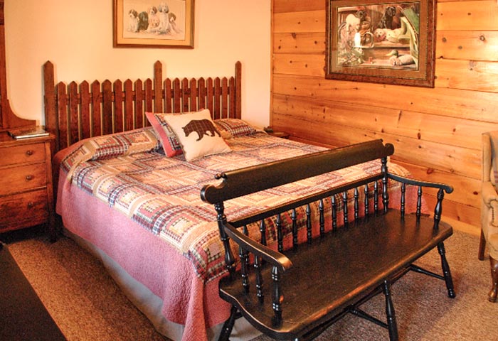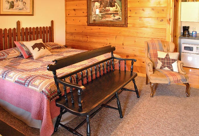 This room filled w/ cozy country charm has a queen-sized bed, a kitchenette and full bathroom.